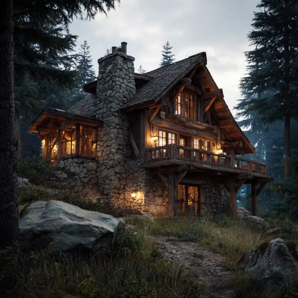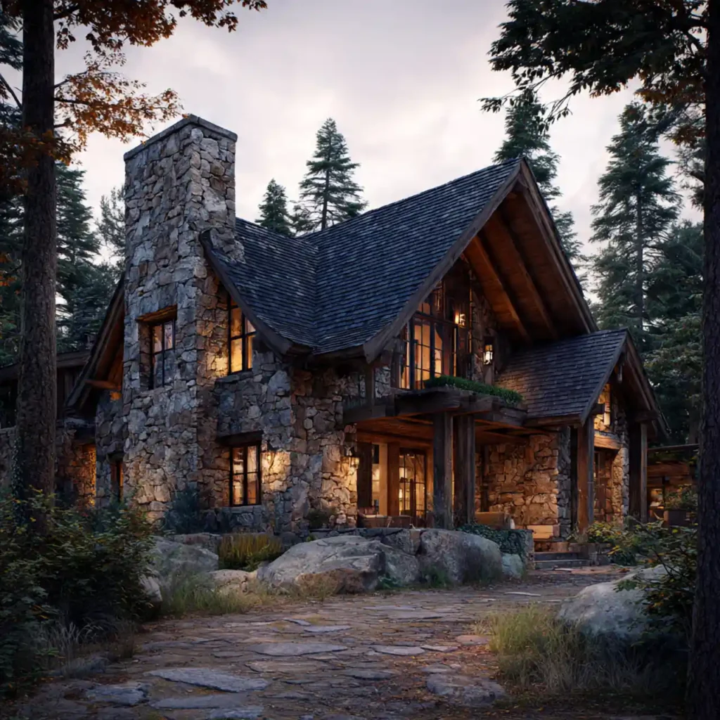 A mountain cabin built with rough stone and natural timber blends perfectly with its surroundings. The stone base makes the house feel strong and grounded. Wooden beams and siding add rustic warmth to the structure. Large windows frame scenic outdoor views beautifully. This design feels cozy, natural, and timeless.