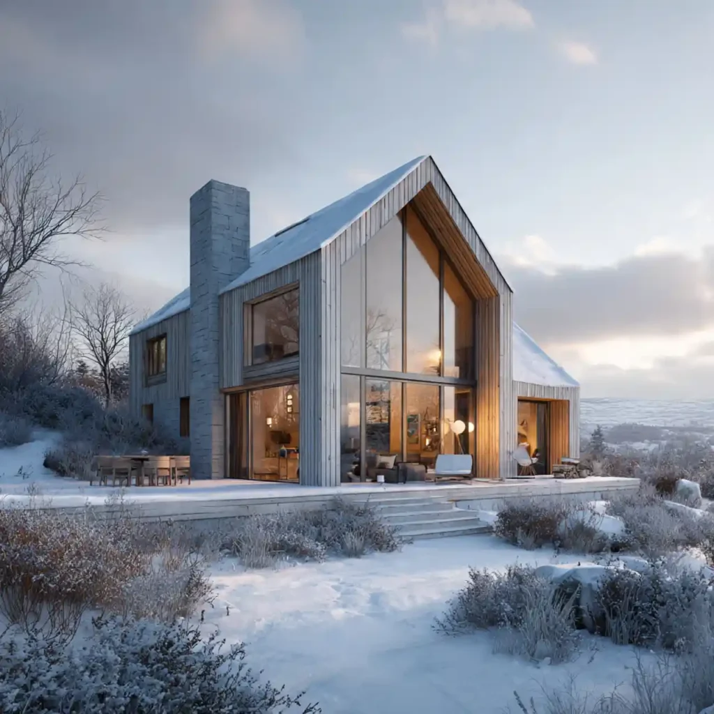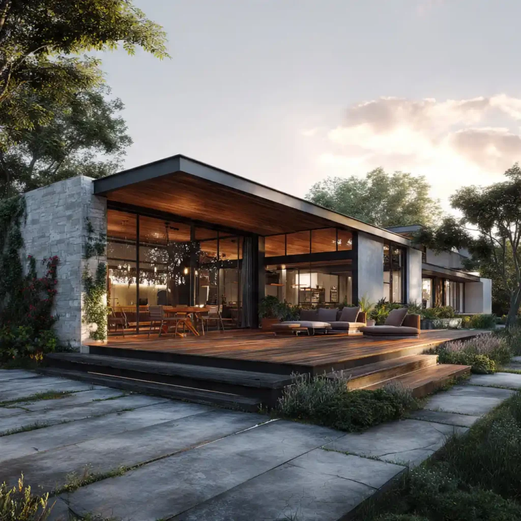 A Scandinavian-inspired home uses light wood with natural stone elements. The simple structure keeps the design calm and balanced. Large windows allow natural light to highlight the materials. Neutral colors create a peaceful atmosphere. This home style feels elegant and naturally modern.