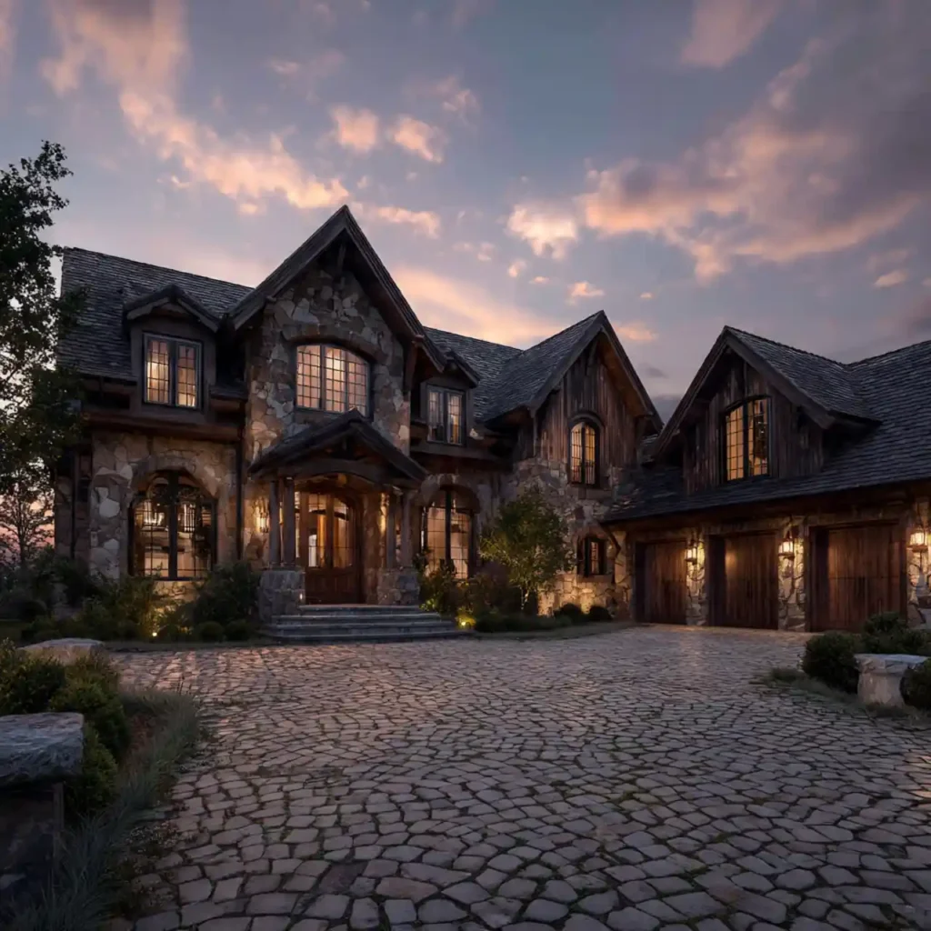 A luxury mansion using large stone walls and rich wooden accents looks powerful and timeless. The stone gives the structure a strong architectural presence. Wooden details add warmth and sophistication. Elegant lighting highlights the materials beautifully. This design feels grand, elegant, and everlasting.