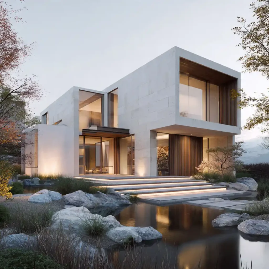 A minimalist home using smooth stone panels and natural wood siding feels modern and refined. The combination adds depth without using too many materials. Clean lines keep the architecture simple and elegant. Large glass windows complement the natural textures perfectly. This design feels sophisticated and timeless.