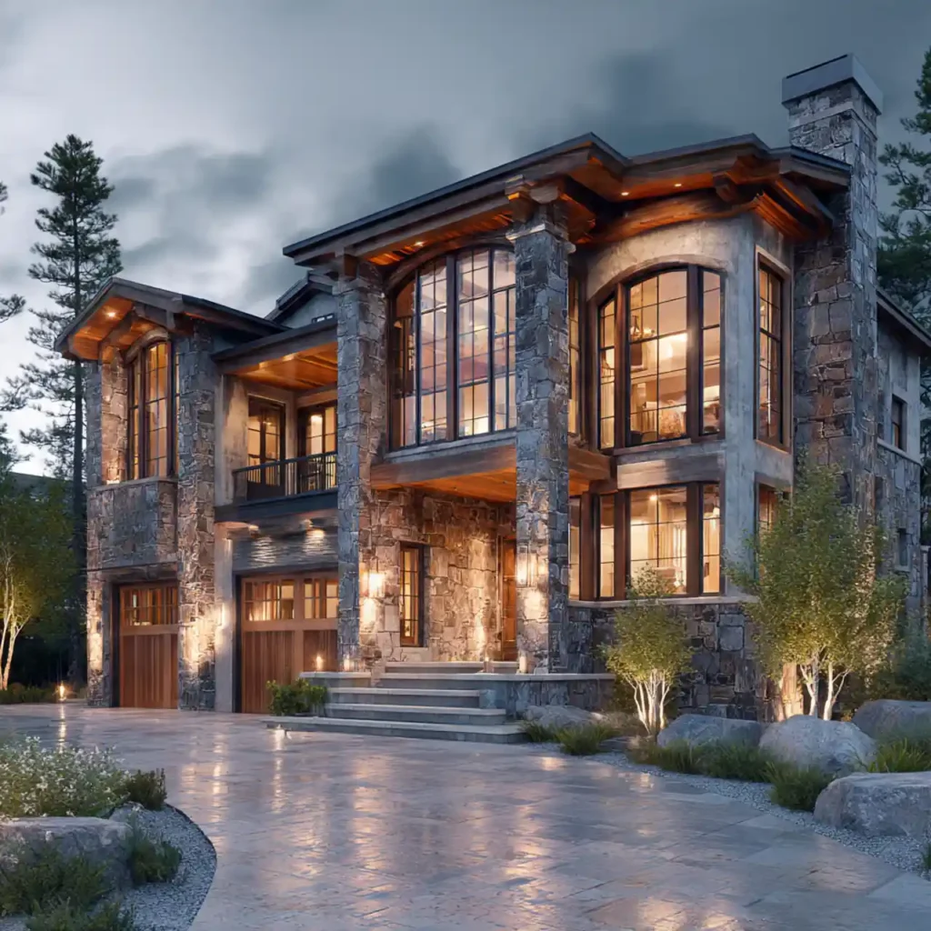 A luxury home with a grand stone facade immediately feels strong and elegant. Wooden accents around windows and doors soften the heavy stone texture. Warm exterior lighting highlights the natural materials. Landscaping enhances the beauty of the facade. This design looks rich and timeless.