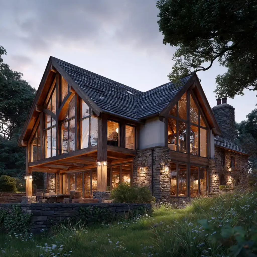 A timber frame structure combined with stone walls creates a classic architectural look. The wooden beams become a beautiful visual feature. Stone panels add durability and texture to the exterior. Large glass openings brighten the interior spaces. This design feels traditional yet luxurious.