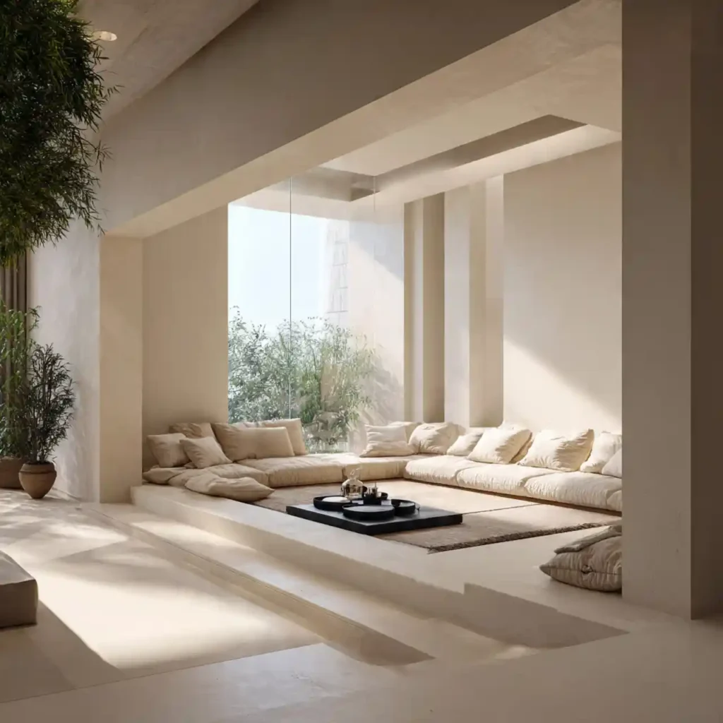 A minimalist sunken seating area creates a clean and uncluttered look. Neutral tones keep the design calm and sophisticated. Low-profile cushions enhance the relaxed feel of the space. The recessed floor naturally defines the seating zone. This design feels modern and effortlessly luxurious.
