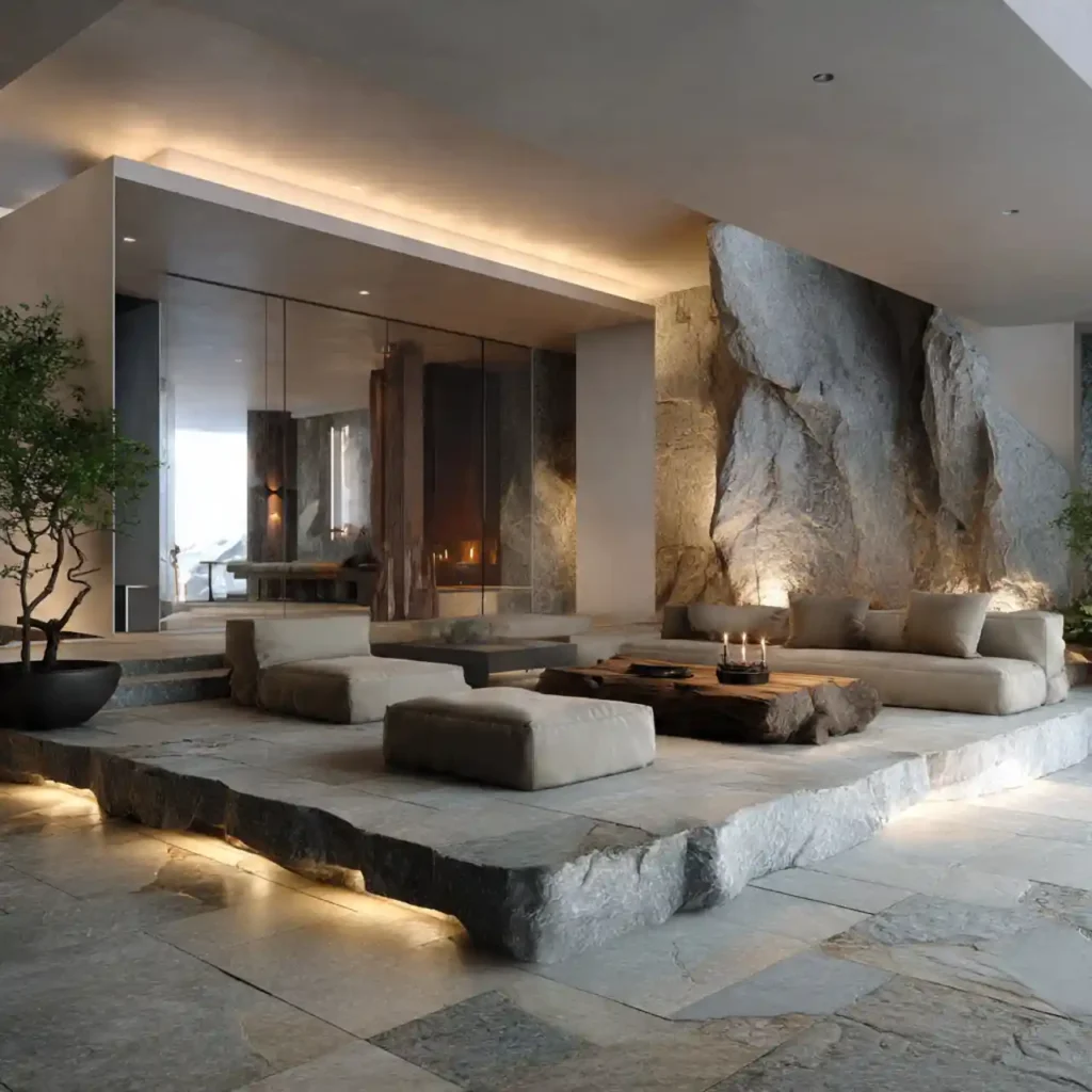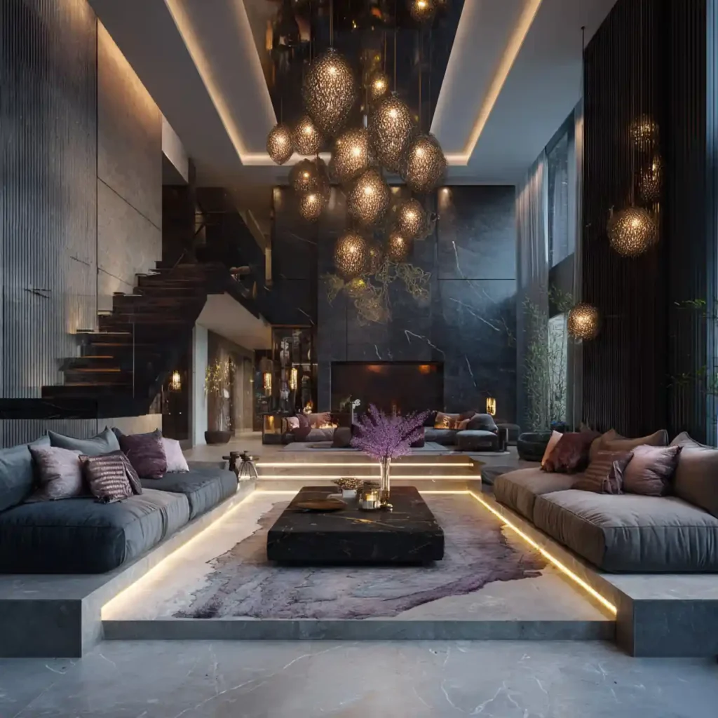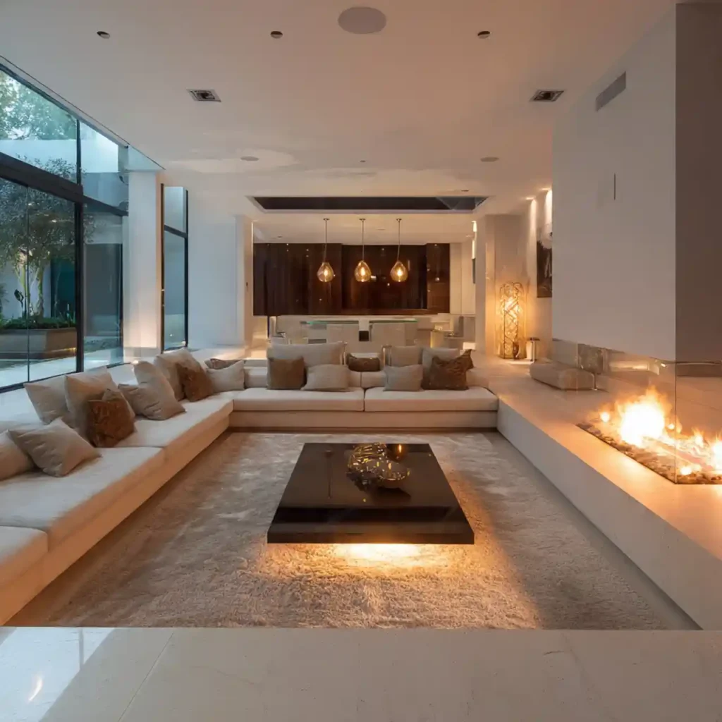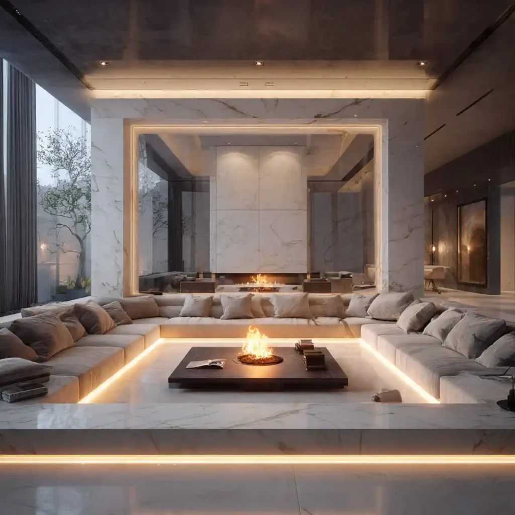 Marble edges around the sunken area add instant elegance. The smooth surface contrasts beautifully with soft seating. Warm lighting highlights the natural stone textures. This design feels refined and high-end. It transforms the living room into a luxury space.