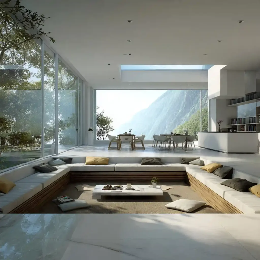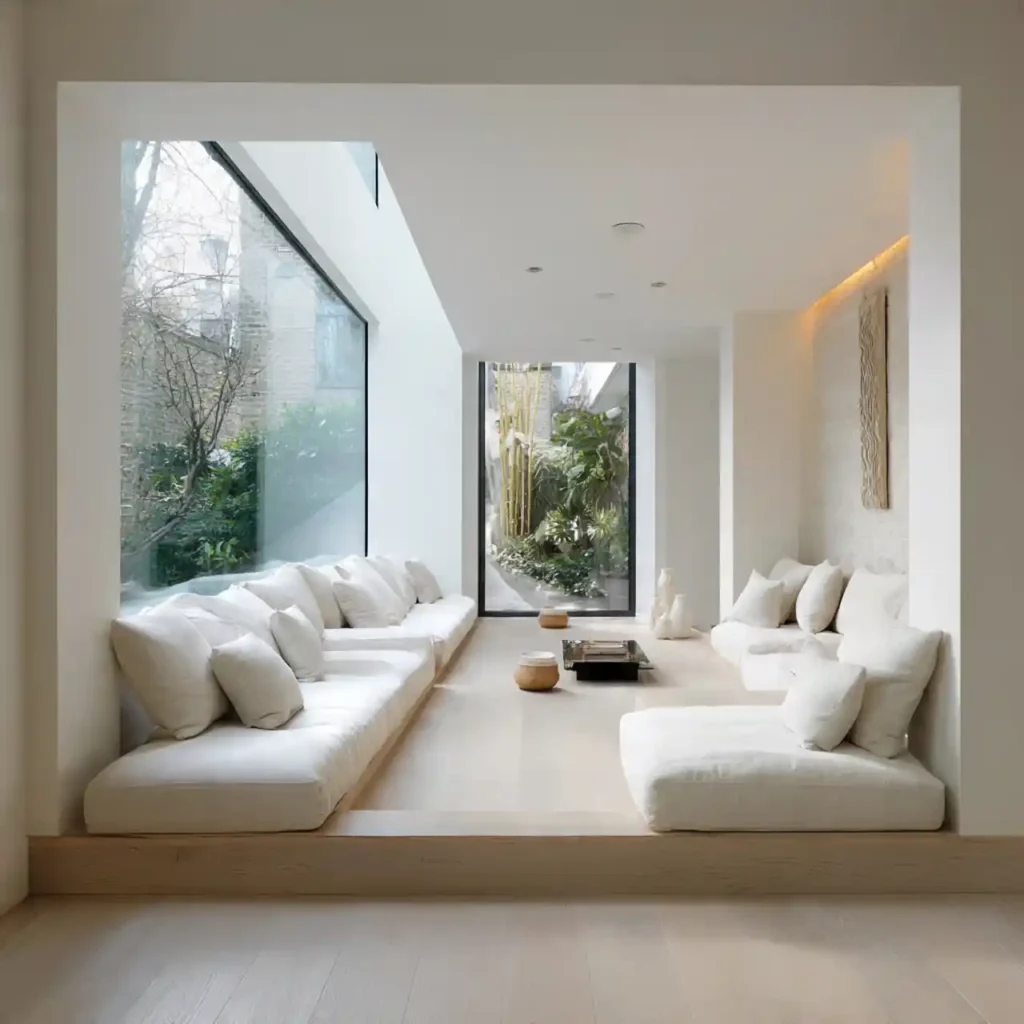 An all-white sunken seating area looks clean and airy. The light color enhances the sense of openness. Soft textures prevent the space from feeling cold. Natural light makes the design even brighter. This style feels elegant and peaceful.