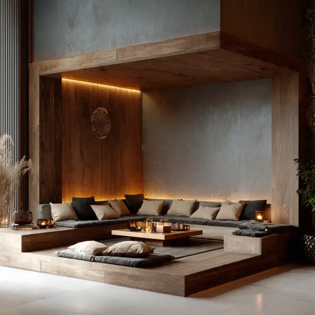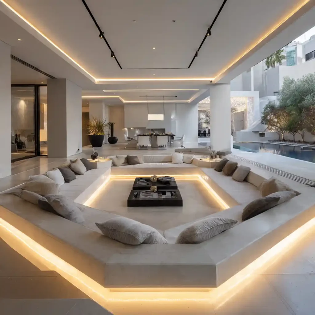 Concrete seating structures create a bold architectural look. The raw material adds an industrial feel. Soft cushions balance the hardness of concrete. Warm lighting softens the overall design. This style feels modern and unique.
