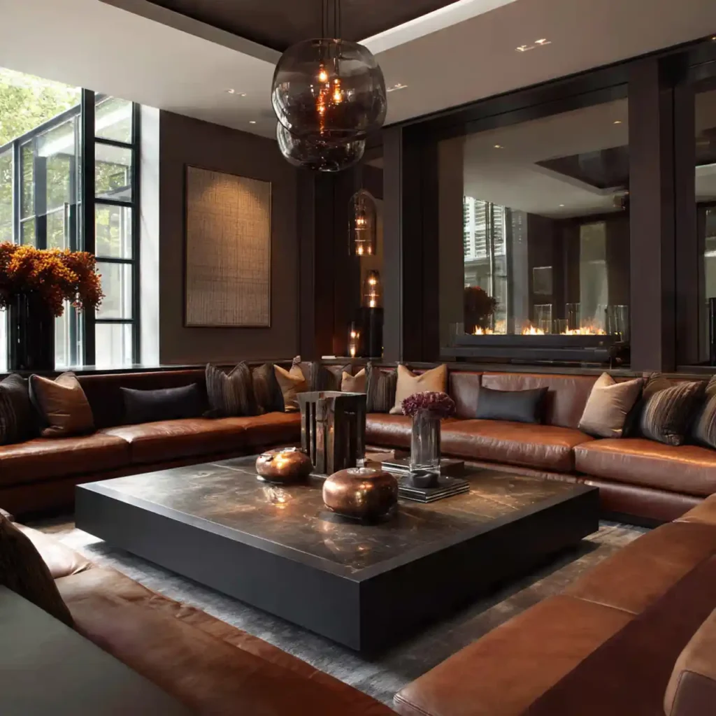 Leather seating adds richness and durability to the space. Warm tones like brown create a cozy environment. The material ages beautifully over time. It pairs well with wood and metal accents. This design feels classic and upscale.
