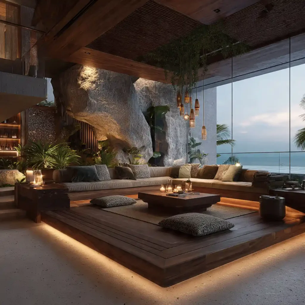 A resort-inspired pit creates a relaxing escape at home. Natural materials like wood and stone enhance the vibe. Soft lighting adds warmth and comfort. The layout feels open and inviting. This design transforms the living room into a luxury retreat.