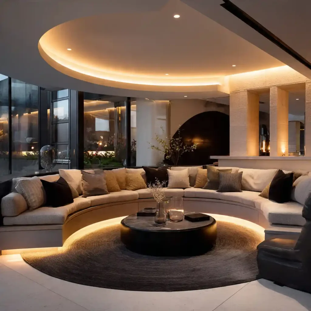 A circular sunken layout creates a more social seating experience. Curved sofas encourage conversation and interaction. A round coffee table completes the design beautifully. This shape feels dynamic and unique. It makes the living room more engaging.