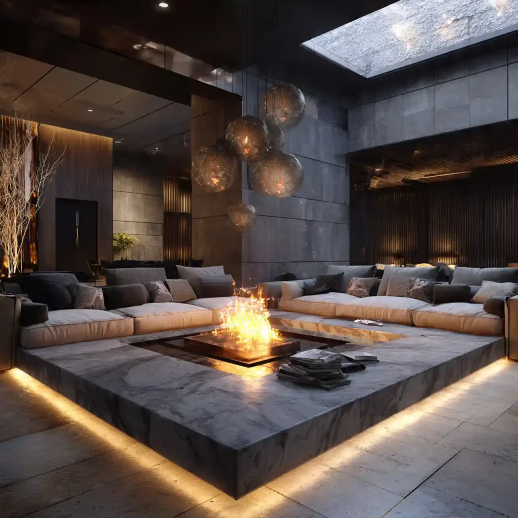 Stone flooring inside the pit creates a natural and textured look. The material adds durability and visual strength. Soft seating balances the rough texture. Warm lighting enhances the stone details. This design feels grounded and luxurious.