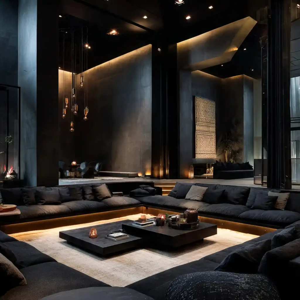 A black themed conversation pit looks bold and dramatic. Dark upholstery adds depth and sophistication. Subtle lighting prevents the space from feeling heavy. Metallic accents enhance the luxury appeal. This design feels modern and stylish.